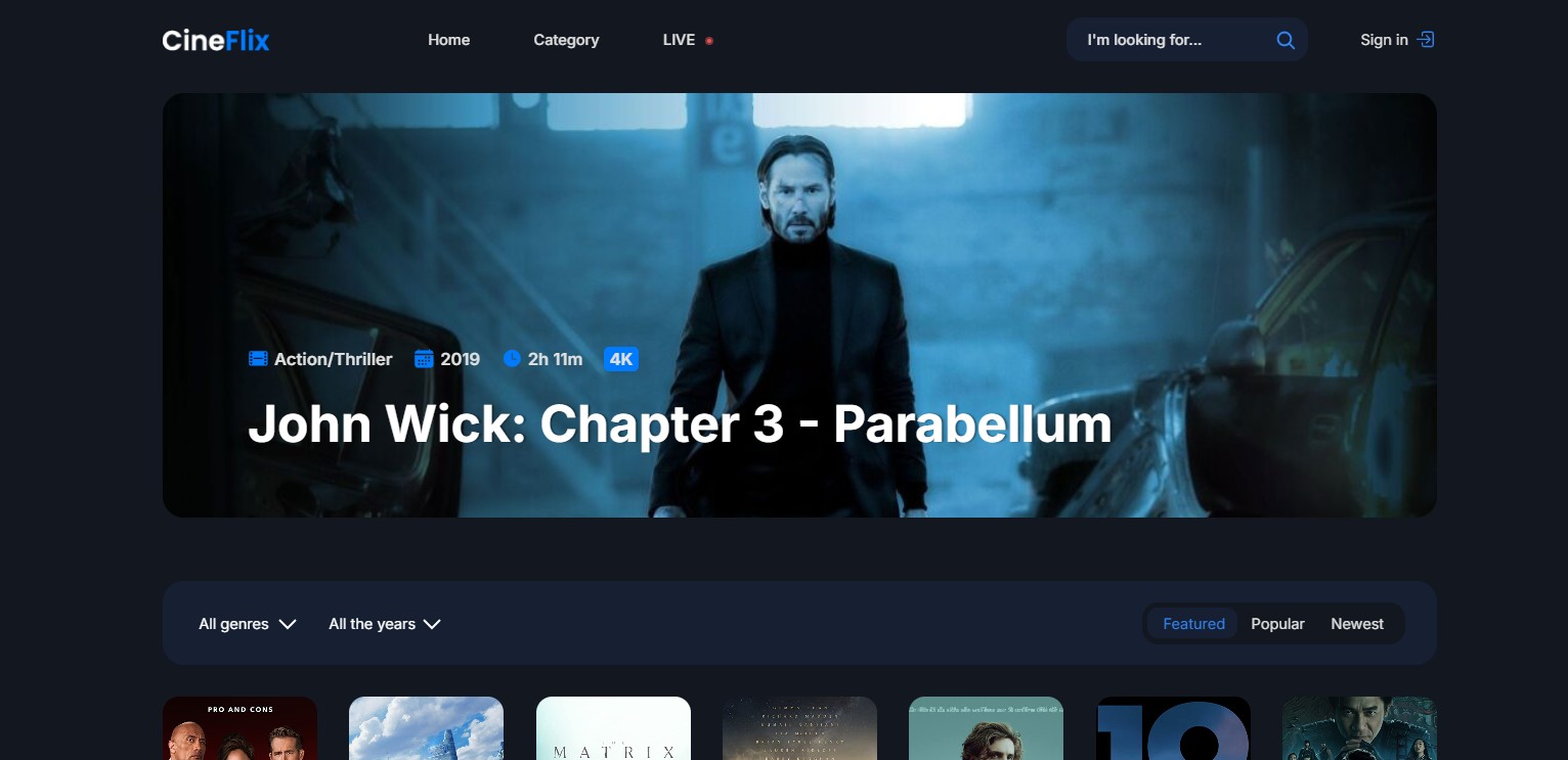 CineFlix is a dynamic movie search application built with HTML, CSS, and JavaScript, utilizing the OMDb API (open-source) to fetch real-time movie data. The app features an interactive search bar, responsive UI, and seamless API integration for fetching movie details like posters, ratings, and descriptions. Optimized for performance with debounced search functionality and modern UI/UX principles to ensure a smooth UX.